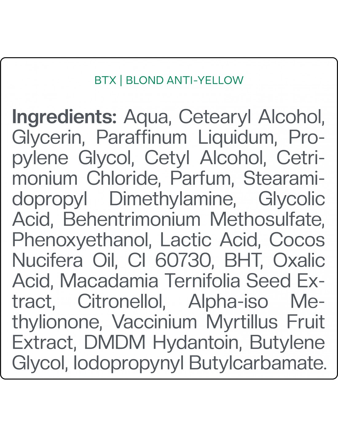 - BLOND ANTI-YELLOW varianto naudojimo atveju – padedamos išspręsti pagrindinės šviesintų plaukų problemos: mažinamas vėlimasis, pūtimasis, apimties kontrolė; plaukai ima žvilgėti, o tuo pačiu kontroliuojamas nepageidaujamų geltonų atspalvių atsiradimas, violetiniai pigmentai suteikia perlamutrinio atspalvio;