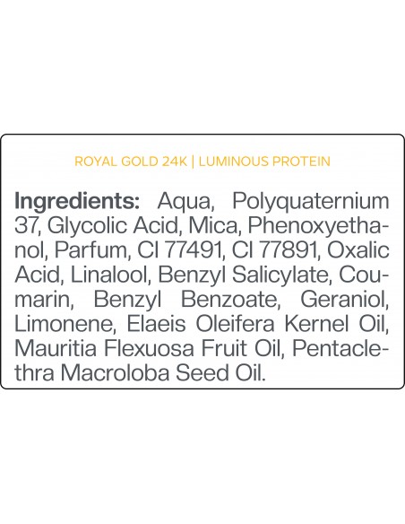 SUDĖTYJE: eksliuzyvinis turtingas amino rūgščių (išgaunamų iš Amazonijos baseino augalų ir jų vaisių) kompleksas, baltymai (proteinas), augaliniai aliejai (lanksčiosios mauricijos aliejus, kongelio aliejus, alyvpalmės aliejus), GLOSSY GOLD (kosmetinis auksas)