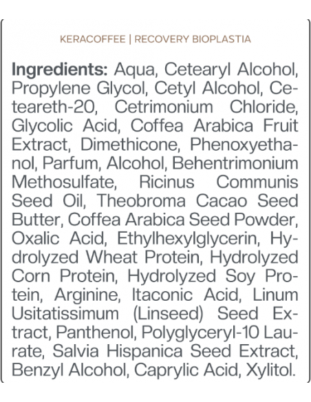 SUDĖTYJE: keratino amino rūgštys, hidrolizuoti ryžių proteinai, hidrolizuotas keratinas, augaliniai ekstraktai: argano aliejus, alijošiaus ekstraktas, cupuacu sėklų sviestas, dygliuotosios astrokarijos aliejus, medetkos ekstraktas, makadamijos aliejus, dumblių kompleksas, Arabikos kavos sėklų ekstraktas, eksliuzyvinis amino rūgščių (išgaunamų iš Amazonijos baseino augalų ir jų vaisių) kompleksas.