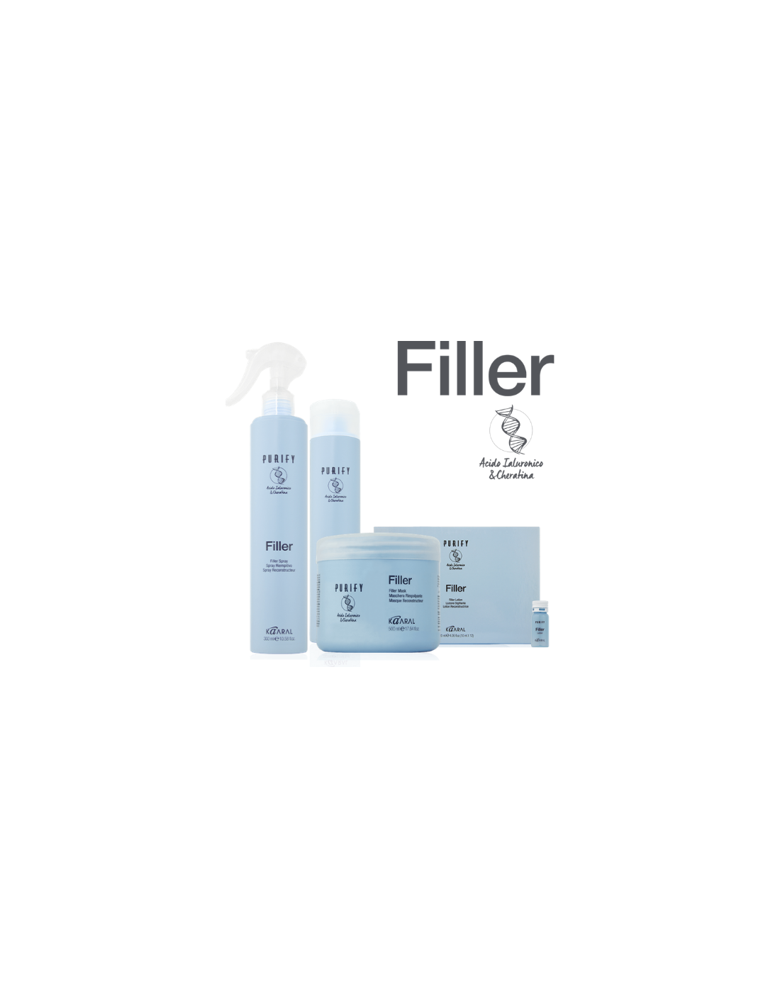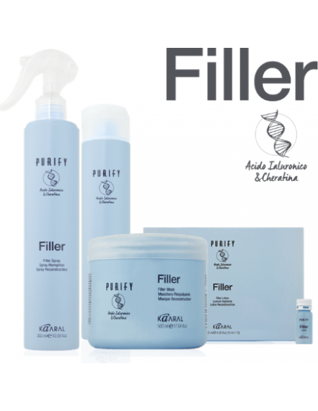 PURIFY FILLER - tai kompleksinė profesionalių plaukų priežiūros produktų linija ir procedūra, skirta trapiems, nualintiems plaukams, linkusiems lūžinėti ir trupėti {pvz., paveiktiems balinimo, šviesinimo, dažymo procedūrų ir agresyvių priemonių}, suteikianti plaukams esminio tvirtumo, lankstumo, tankumo bei apimties, kovojanti su senėjimo požymiais ("anti-age "poveikis), pripildanti plauko giluminę struktūrą ekskliuzyviniu hialiurono rūgšties bei keratino kompleksu, veikiančiu beprecedentės sinergijos principu.