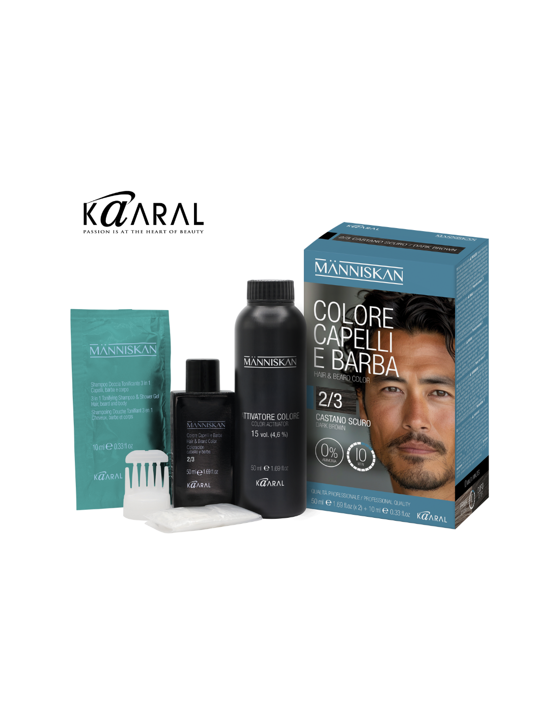 Vyriški beamoniakiai profesionalūs tonuojamieji dažai plaukams ir barzdai/ūsams, rinkinys naudojimui namuose Människan (KAARAL, Italija)