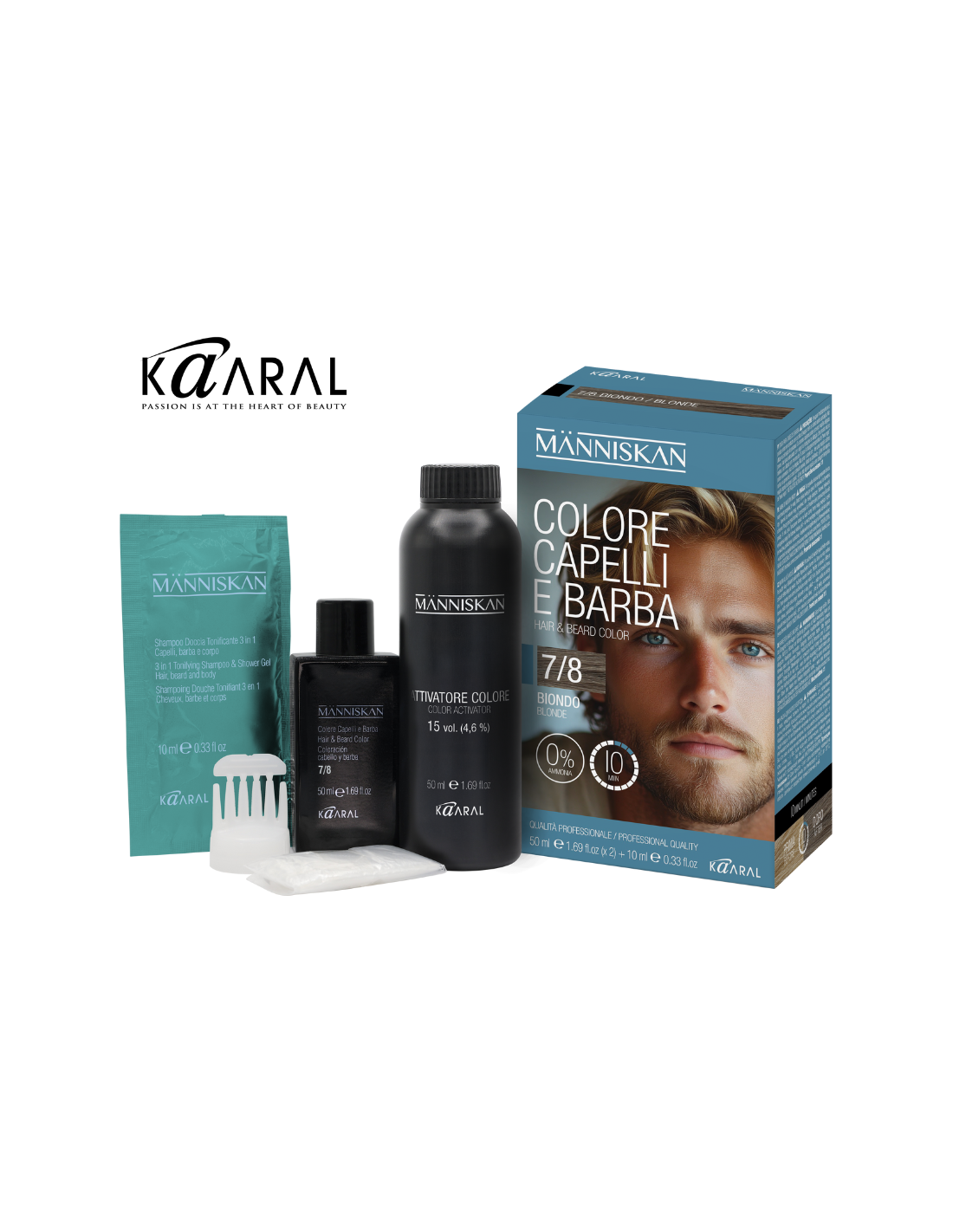 Vyriški beamoniakiai profesionalūs tonuojamieji dažai plaukams ir barzdai/ūsams, rinkinys naudojimui namuose Människan (KAARAL, Italija)