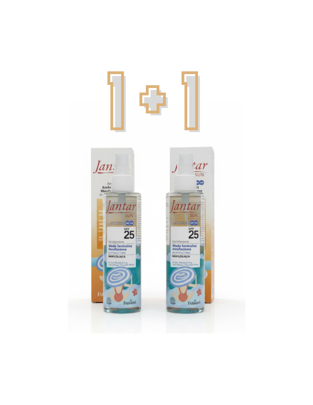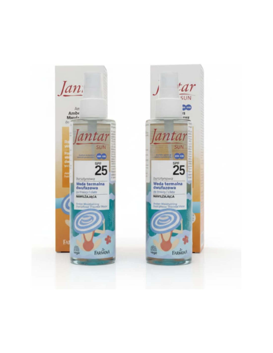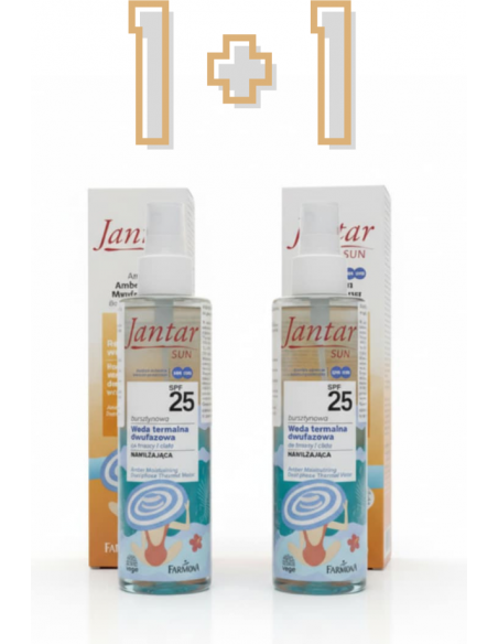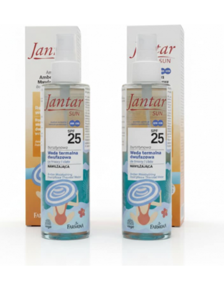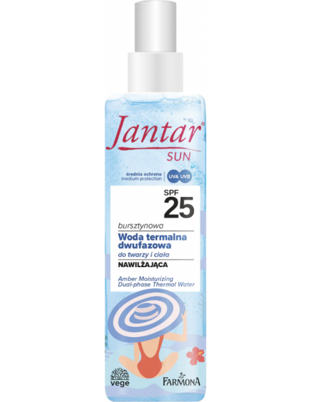 Patirkite puikią apsaugą nuo saulės su Farmona Jantar Sun Amber drėkinamuoju dvifaziu terminiu vandeniu SPF 25.
