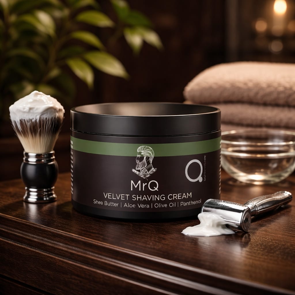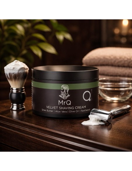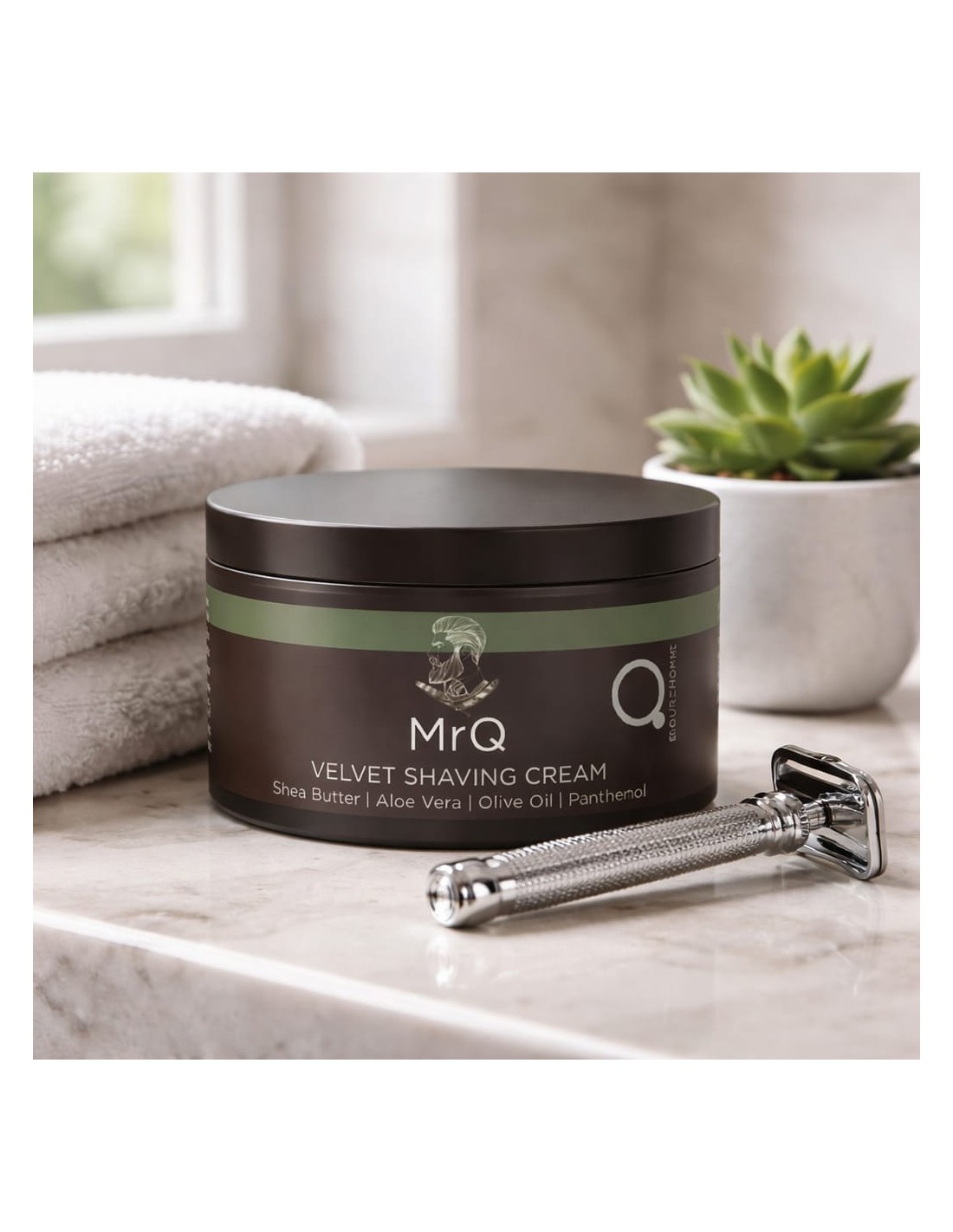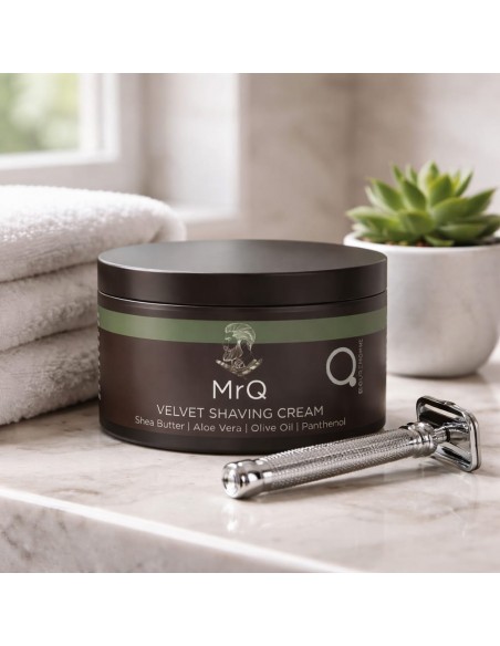 MrQ Vyriškas aksominio švelnumo skutimosi kremas, su alijošiumi, taukmedžio sviestu, alyvuogių aliejumi, glicerinu, vitaminu E, 250 ml