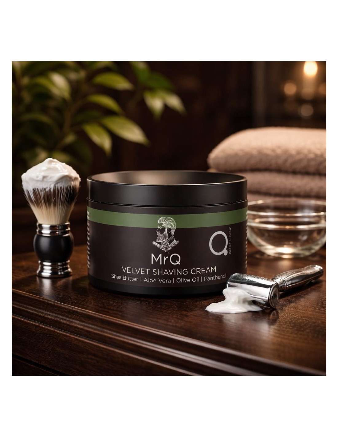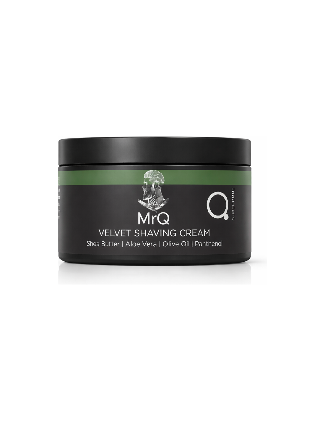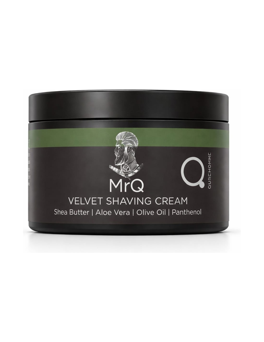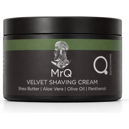 MrQ Vyriškas aksominio švelnumo skutimosi kremas, su alijošiumi, taukmedžio sviestu, alyvuogių aliejumi, glicerinu, vitaminu E