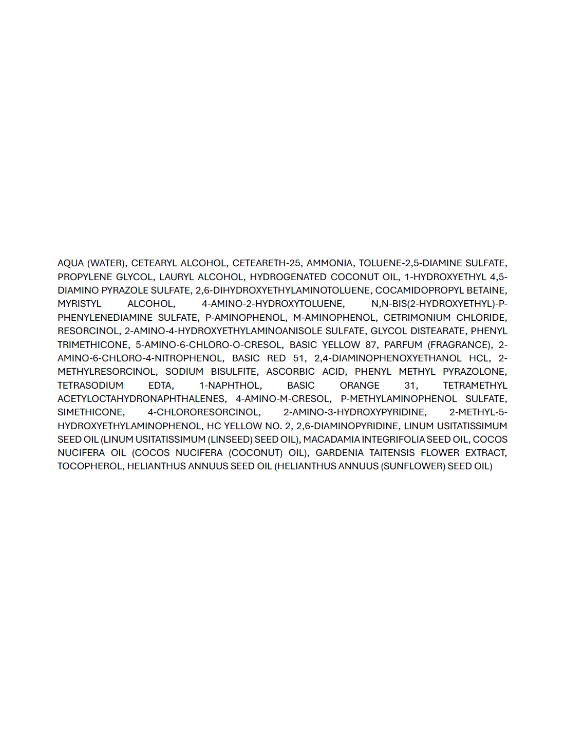 • не содержит: PPD (парафенилендиамин), Лаурилсульфат натрия (SLS), Лаурет сульфат натрия (SLES), Спирт, Минеральное масло.