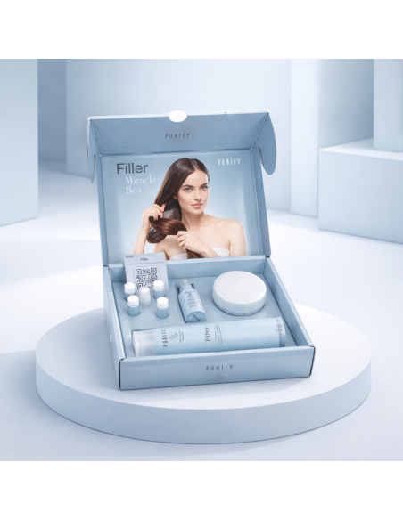 PURIFY FILLER — профессиональная линия космецевтических средств по уходу за ломкими, изношенными волосами, склонными к ломкости и ломкости {например, подвергшихся обесцвечиванию, осветлению, окрашиванию и агрессивным продуктам}, придающая волосам необходимую силу, гибкость, густоту и объем, борьба с признаками старения («антивозрастной» эффект), наполнение глубокой структуры волос эксклюзивным комплексом гиалуроновой кислоты и кератина, действующим по принципу беспрецедентной синергии.