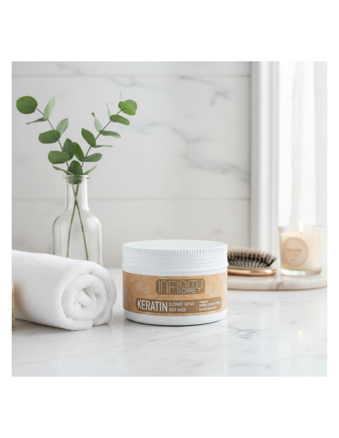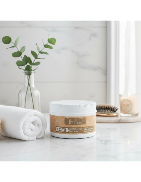 Откройте для себя восстанавливающую маску для волос Keratin Ultimate Repair 1000 мл — идеальное решение для восстановления волос и придания им блеска. ✨ Благодаря гидролизованному кератину, который оказывает защитное действие и питает волосы, эта маска восстанавливает волокна волос изнутри в поврежденных зонах, создавая здоровые и блестящие волосы.